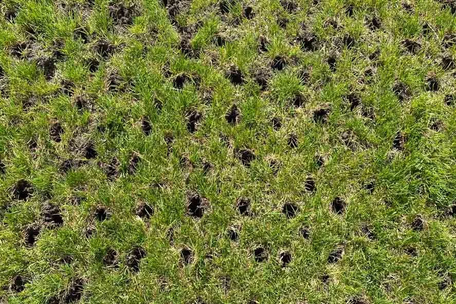 Our aeration equipment removes small cores of soil from your lawn. These cores are approximately 2 inches deep and are removed every 4-5 inches apart. The cores gradually dissolve back into the soil and the turf roots grow back into the small holes that were created in the process.