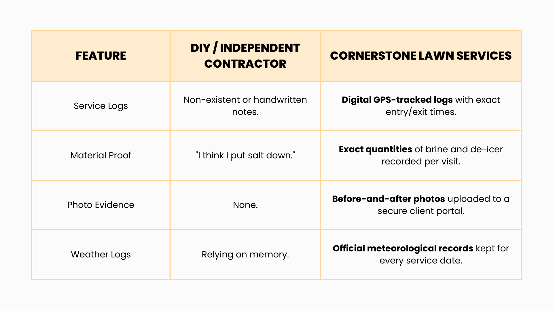 In a slip-and-fall lawsuit, the case often boils down to your word against the victim’s. A claimant might argue your sidewalk was a "sheet of glass" at 8:00 AM. Without proof, how do you defend yourself? This is where Cornerstone provides a service that a DIY shovel or a neighborhood teenager simply cannot: The Digital Paper Trail.